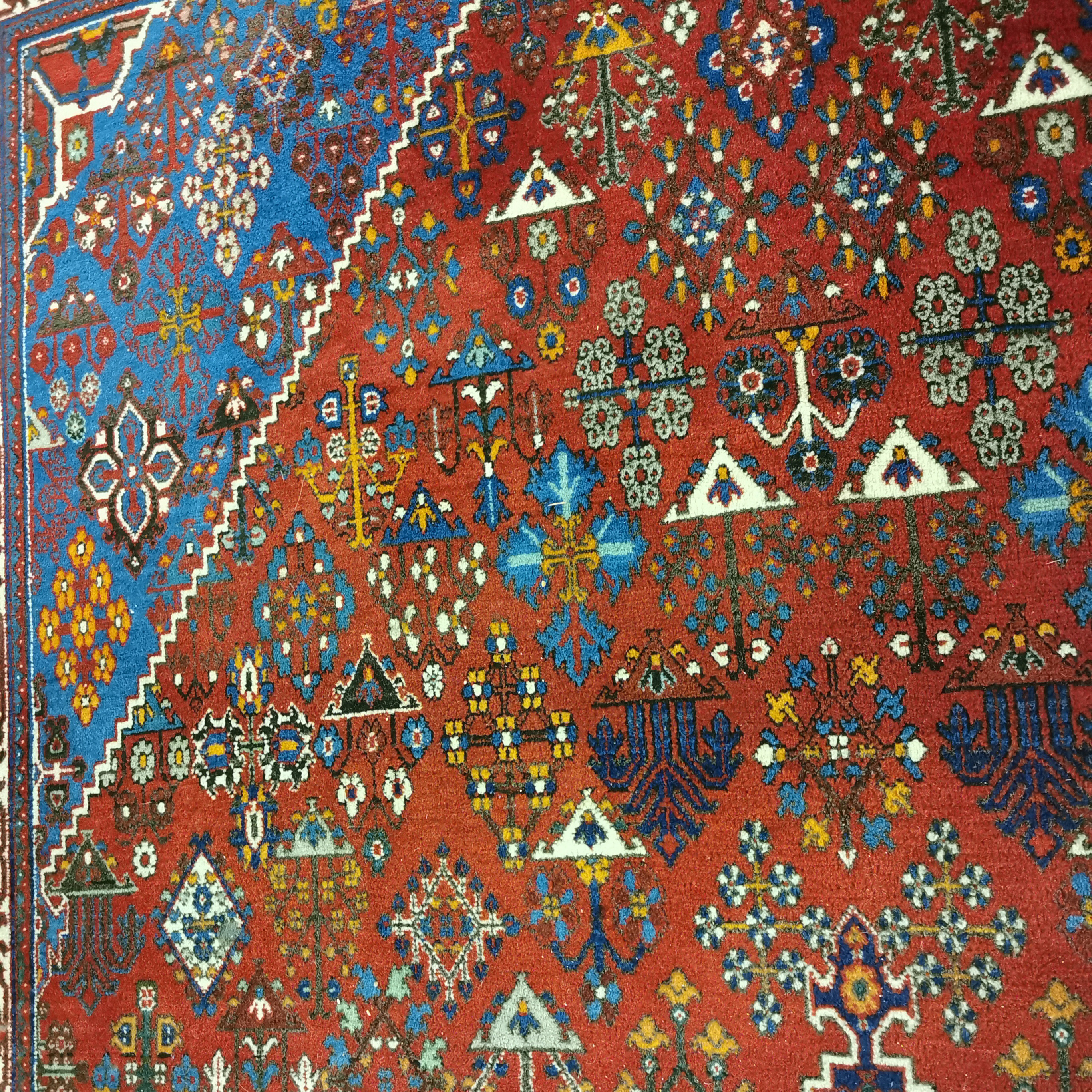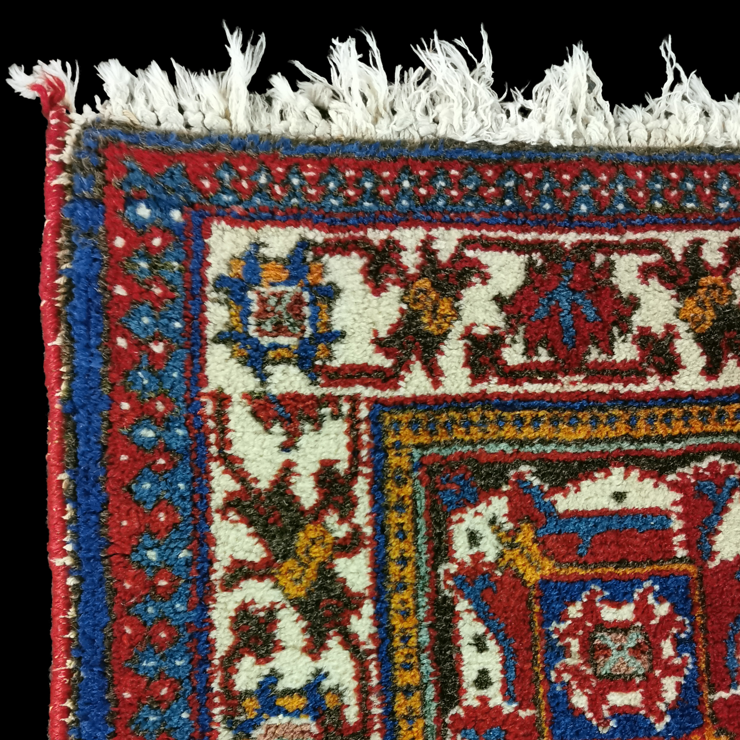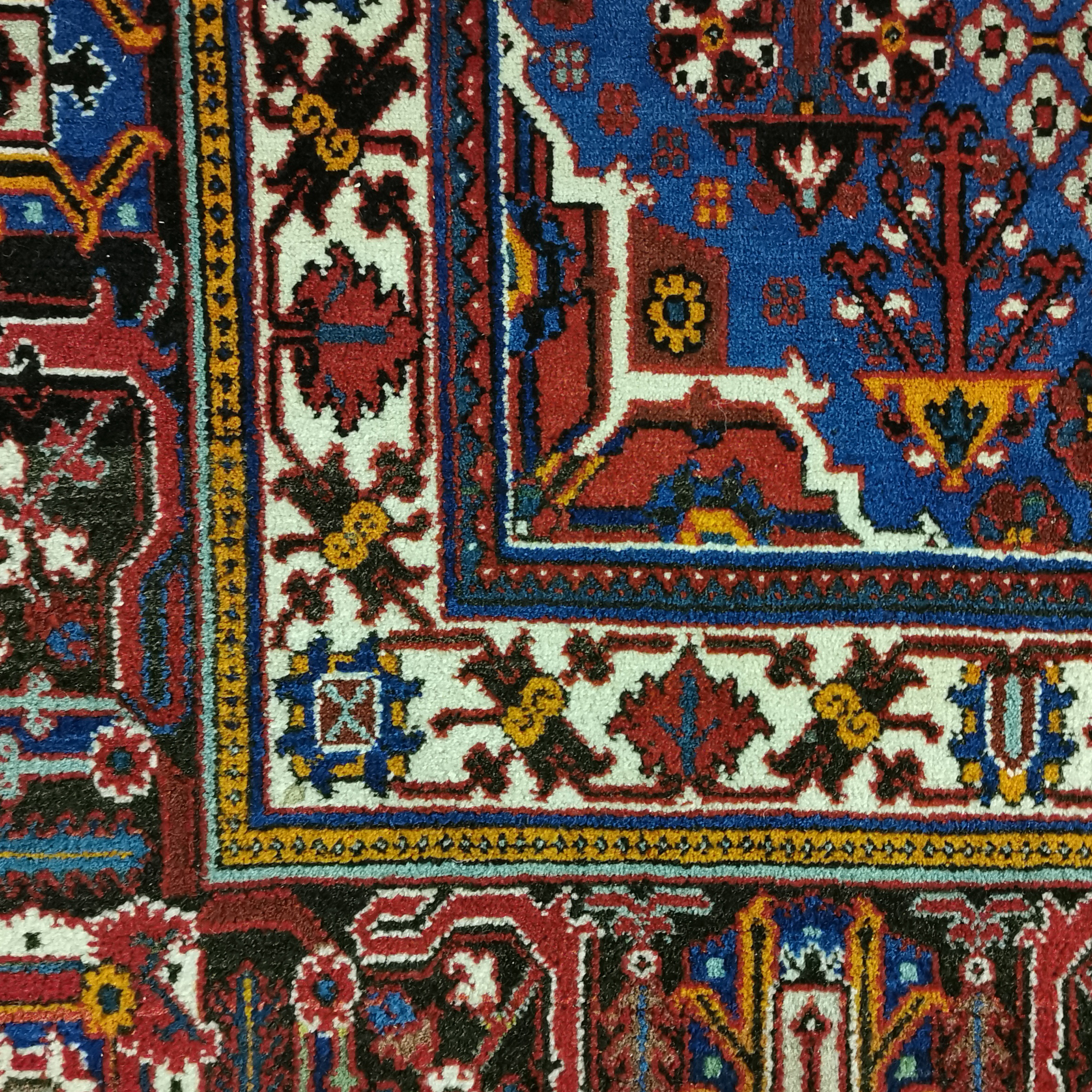 Die Fransen sind zum Teil etwas abgenutzt und eine Ecke leicht beschädigt. Der Teppich hingegen ist nicht abgetreten, es gibt keine Löcher oder Flecken und er stammt aus einem nicht Raucher Haushalt ohne Haustiere.