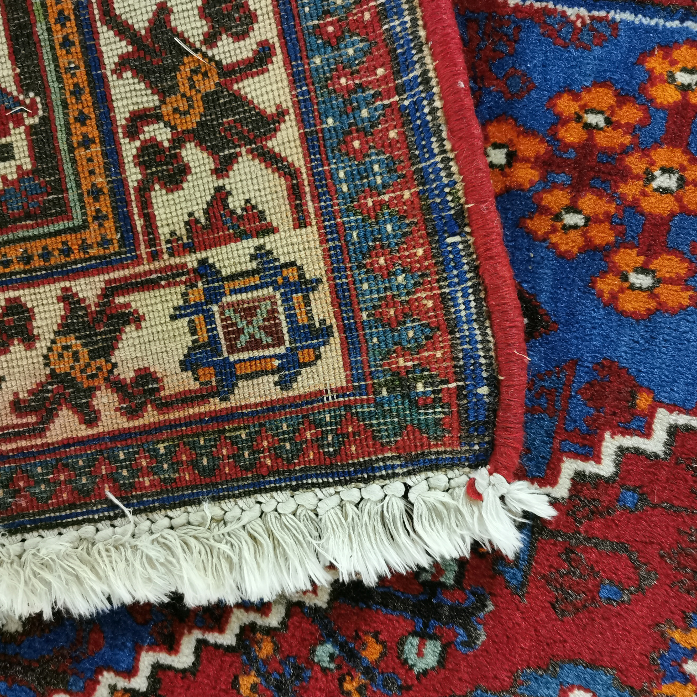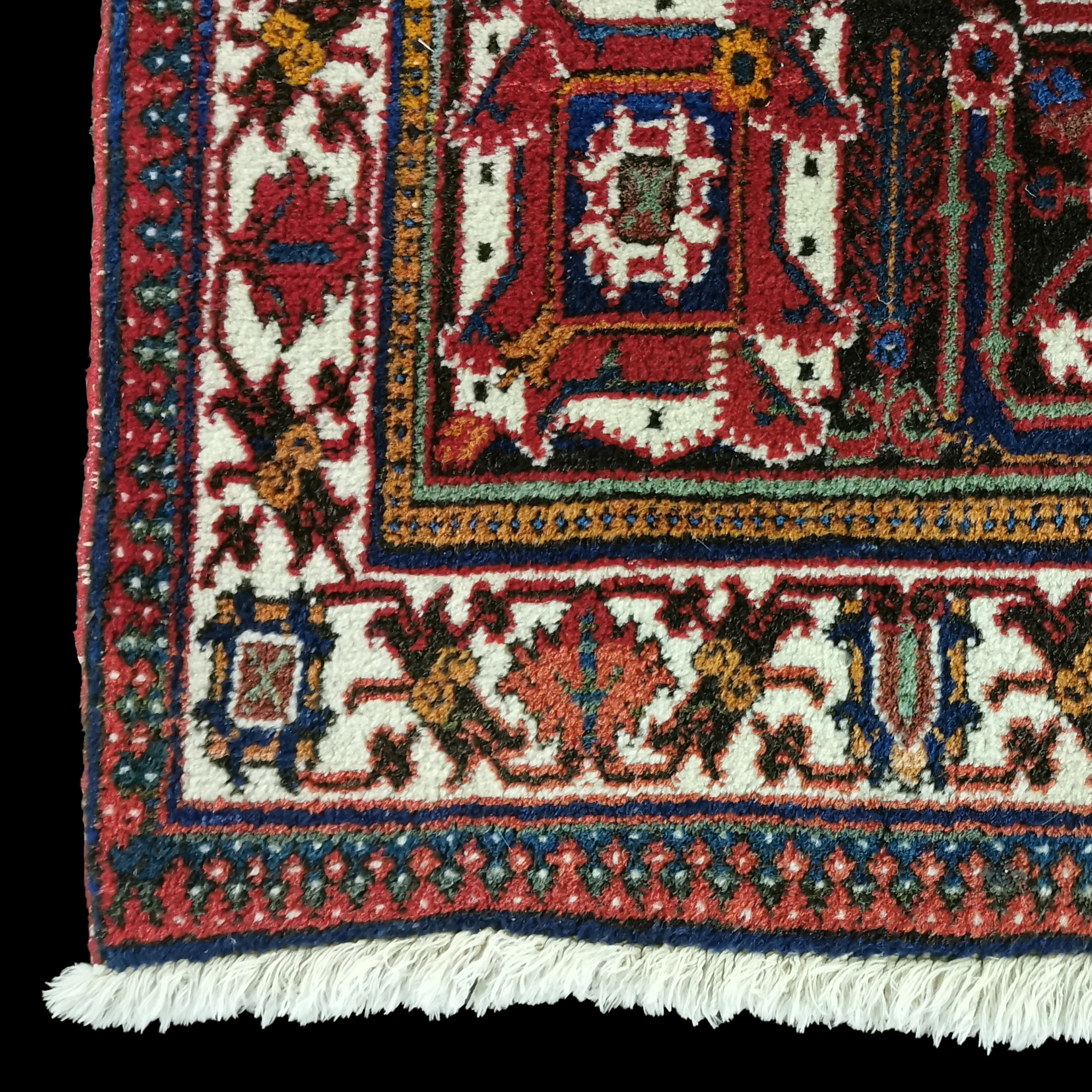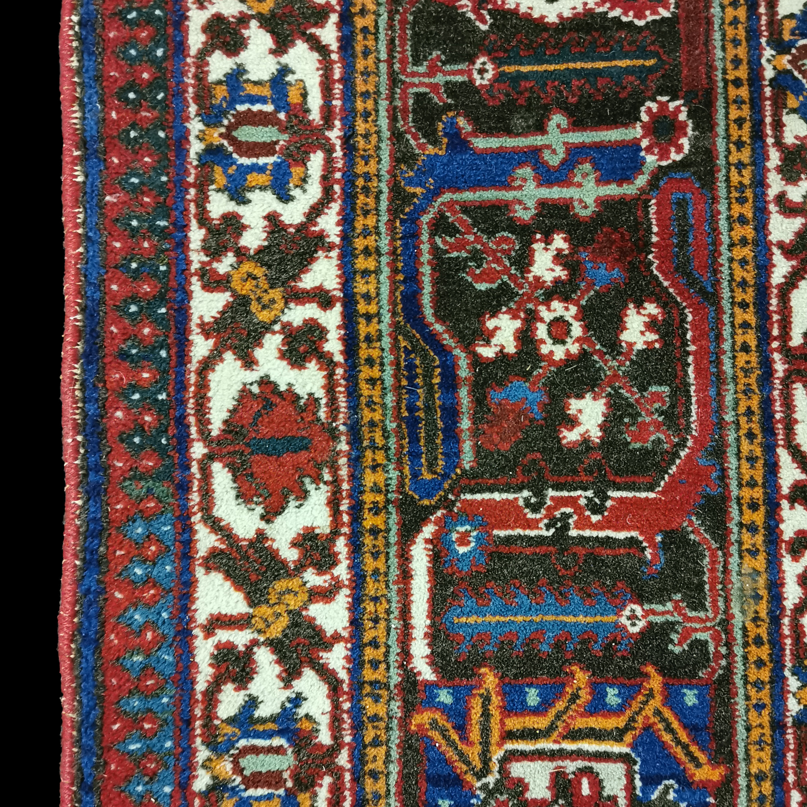 Die Fransen sind zum Teil etwas abgenutzt und eine Ecke leicht beschädigt. Der Teppich hingegen ist nicht abgetreten, es gibt keine Löcher oder Flecken und er stammt aus einem nicht Raucher Haushalt ohne Haustiere.