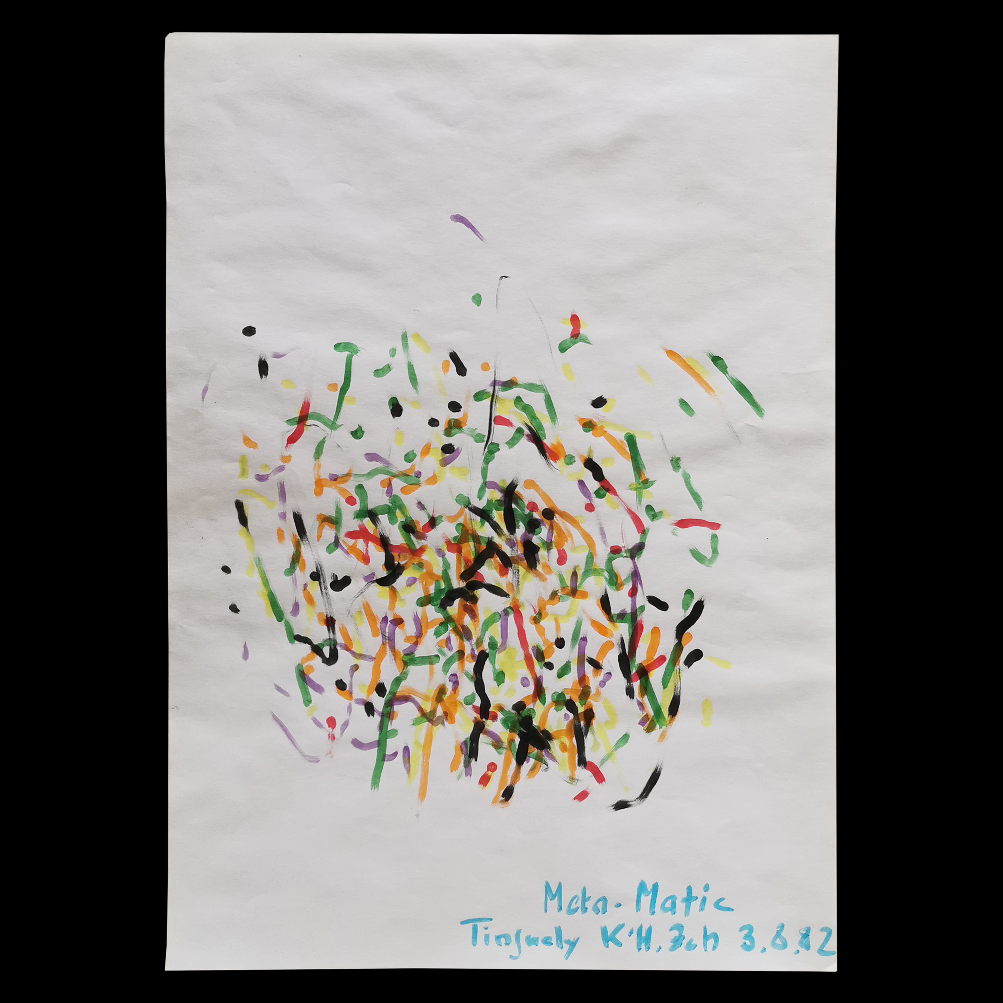maschinenähnlichen Skulpturen sind für seine Stilistik sehr typisch und in weltweiten Metropolen und namenhaften Orten platziert. «Mitte der 1950er Jahre begann Jean Tinguely mit der Produktion einer Reihe generativer Werke mit dem Titel Métamatics: Maschinen, die Kunstwerke produzierten.» Dieses Werk von Tingueli ist eins davon und stellt ein fertiges Gemälde aus einer Maschine dar – mit der Nummerierung 3.8.8.2. Ein interessantes Ensemble von Punkt und Strichen, die im bunten Miteinander eine gewisse Dynamik bilden.