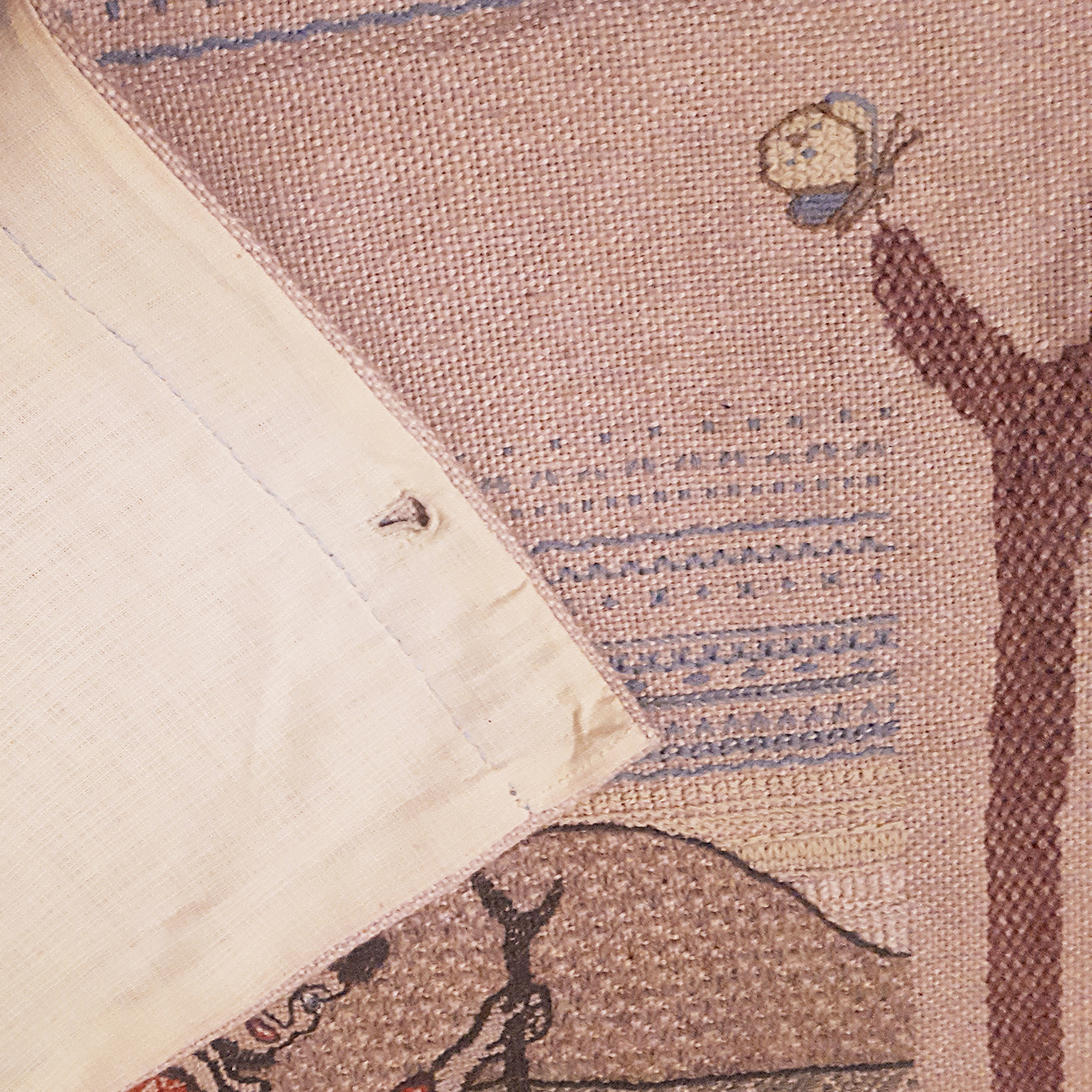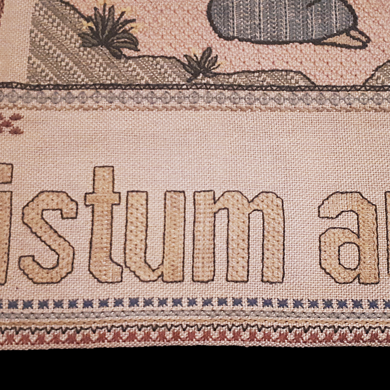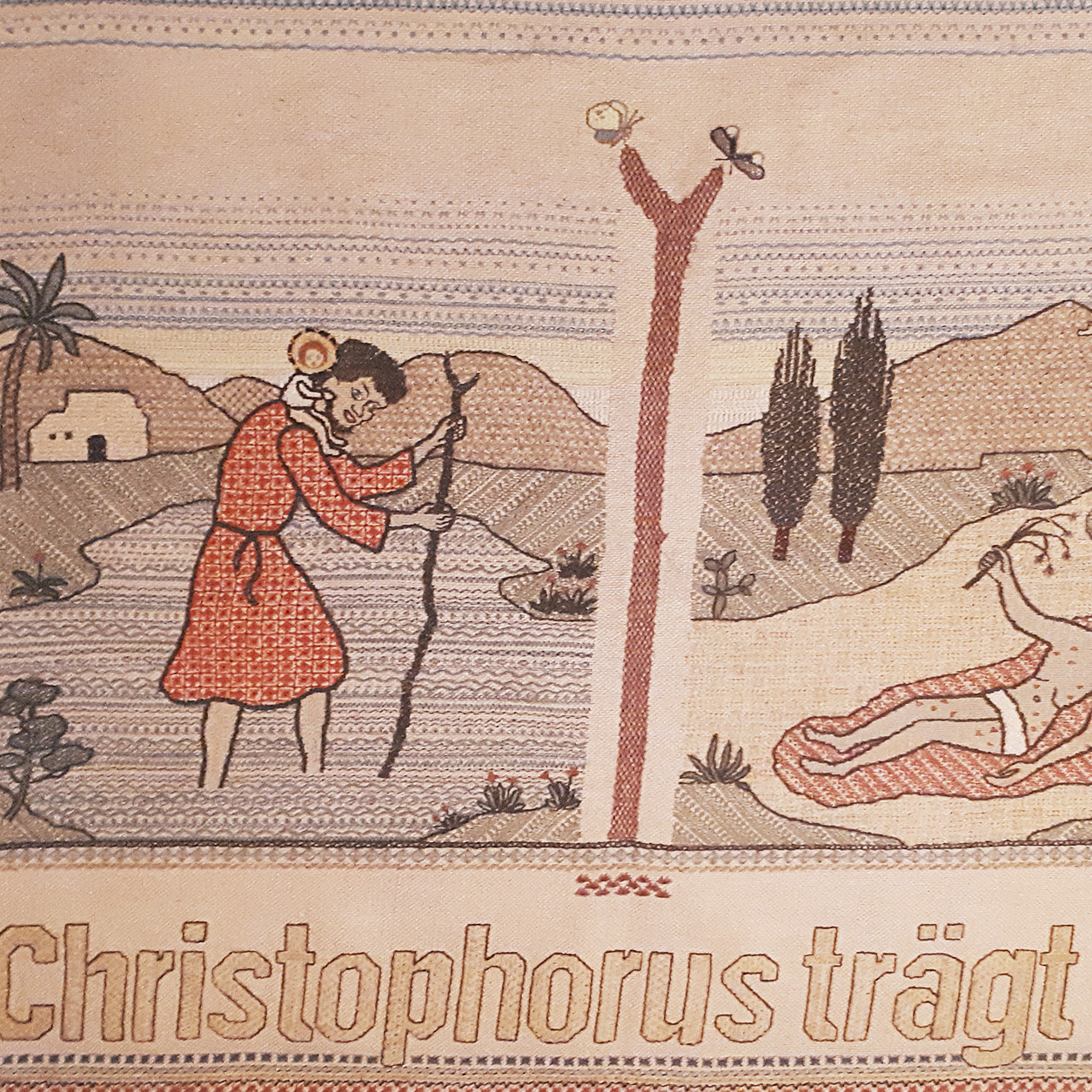 Dieser alte Quilt mit warmen, erdigen Tönen illustriert, wie die gewebte Beschriftung es im unteren Bereich beschreibt «Das Leben eines Christen in vierlei Praktiken». Drei Baumstämme trennen die Komposition der Darstellung und bilden für den Betrachter vier simultane Szenen und einen Blick ins Leben eines praktizierenden Christen.