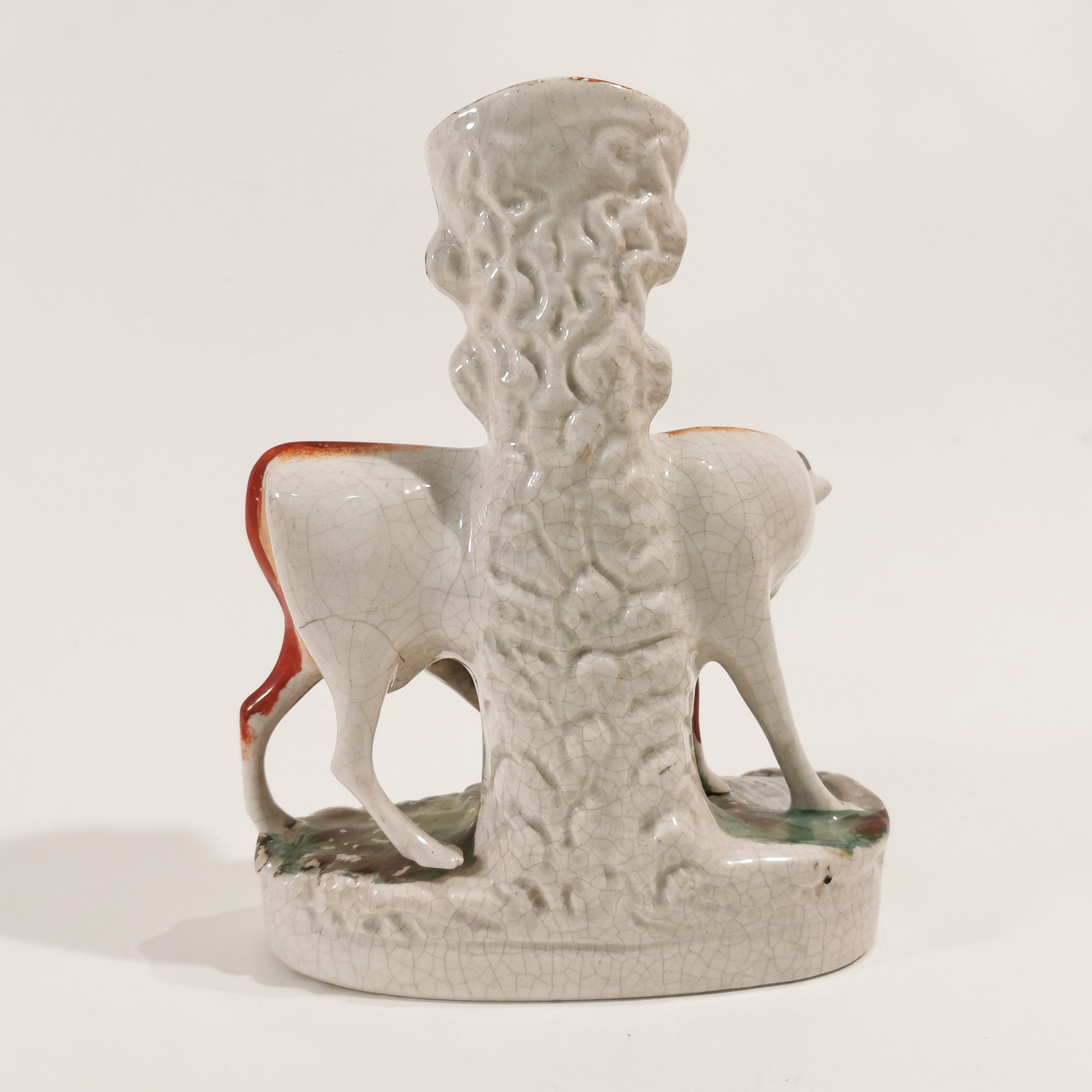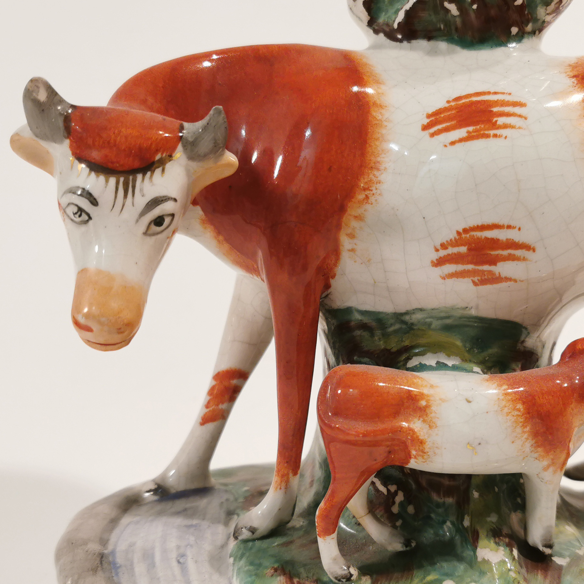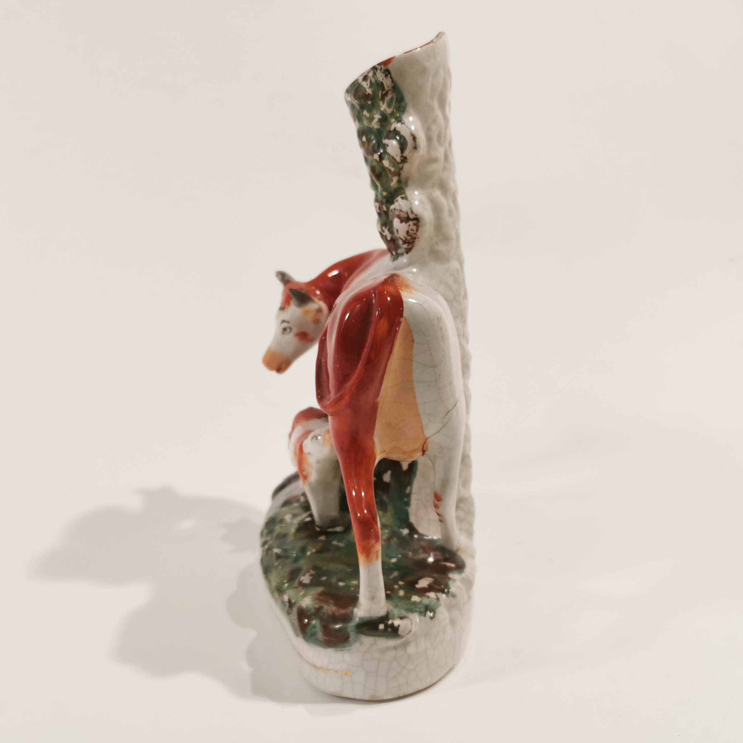 Sehr schöne antike englische viktorianische Staffordshire-Keramikfigur aus dem späten 19. Jahrhundert. Modelliert als Kuh mit ihrem Kalb, das an einem Flussufer unter einer Überlaufvase weidet, die als Baumstamm geformt ist.